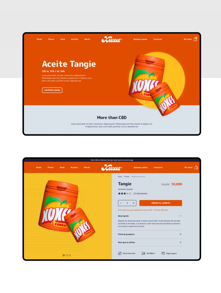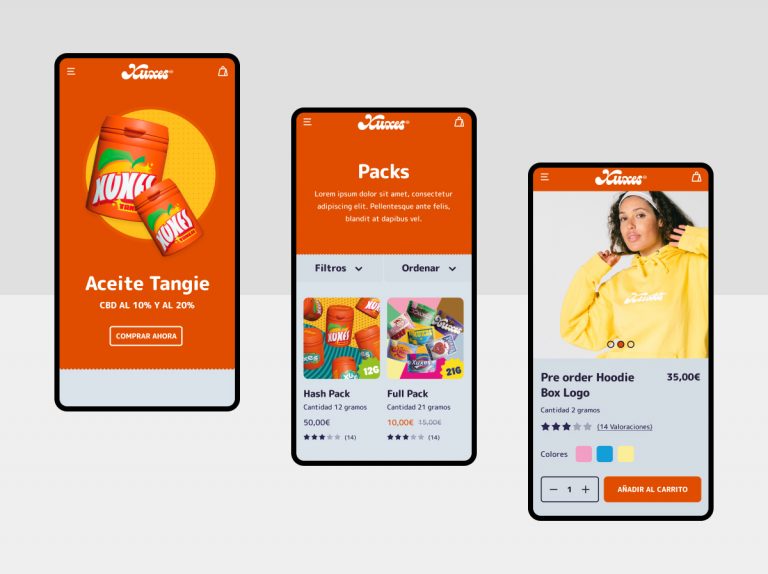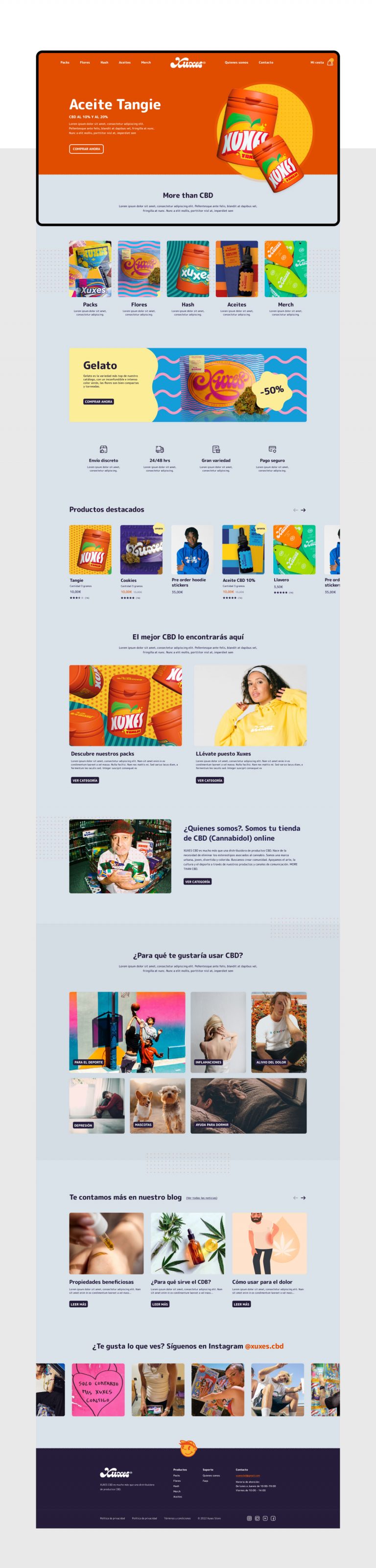 Diseño web para Xuxes.store, distribuidora de productos CBD. Marca urbana, joven, divertida y colorida, que busca crear comunidad para apoyar el arte, la cultura y el deporte a través de los productos CBD.